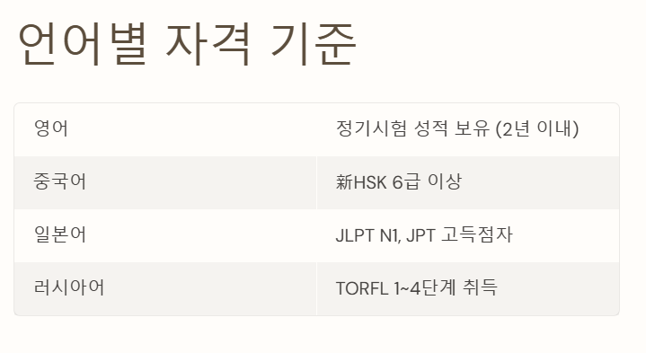 | 러시아어 | TORFL 1~4단계 취득 | 러시아어권 2년 유학 또는 3년 이상 거주, 러시아어 전공(4년제 대졸 이상) |