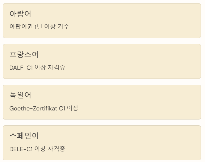 | 프랑스어 | DALF-C1 이상 자격증 취득 | 프랑스어권 3년 이상 거주 또는 대학 전공 및 거주 경력 |