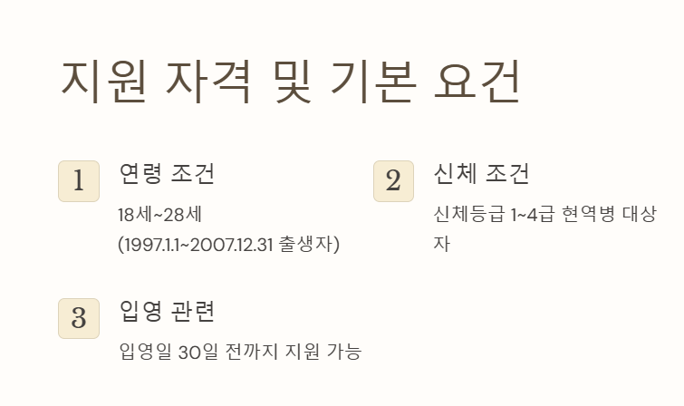 - 2025년 기준: 만 18세 이상 28세 이하 (1997년 1월 1일 ~ 2007년 12월 31일 출생자)