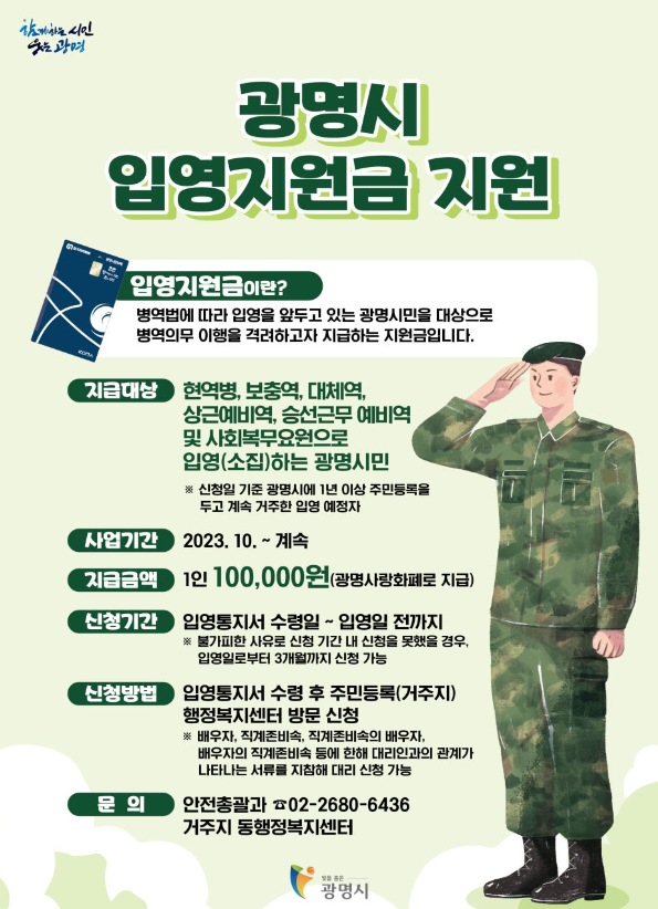 - 지원 대상: 광명시에 1년 이상 주민등록을 두고 계속 거주한 입영 대상자