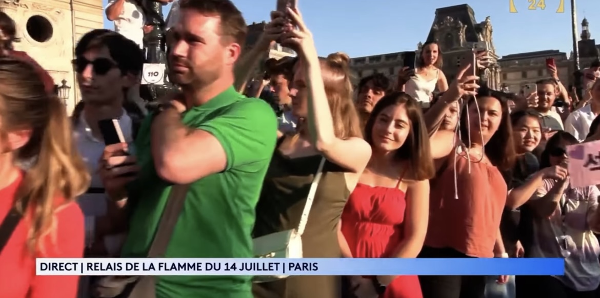 진은 성화를 들고 루브르 박물관 앞을 행진하며 팬들과 소통하는 시간을 가졌습니다.